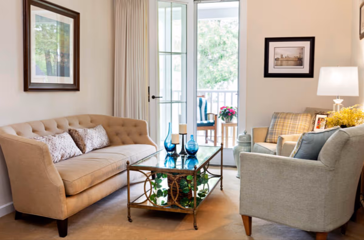 Security's tight, with all the safety features you'd expect, so those with memory or mobility challenges can feel safe moving about, and folks with dementia can join activities that stimulate memory and keep everyone calm; the secured memory care unit is specially designed for this, with expert staff who know how to help. Transportation takes people out to appointments or errands so there's no driving needed, and everyday hassles like housekeeping, laundry, maintenance, and utilities are looked after by the staff, which frees up time for residents to enjoy the gardens, the beauty shop, or just to visit with friends. The grounds have walking paths, outdoor space, and areas to sit and enjoy the view, and the common areas inside are elegant but very comfortable, making it easy to settle in.
