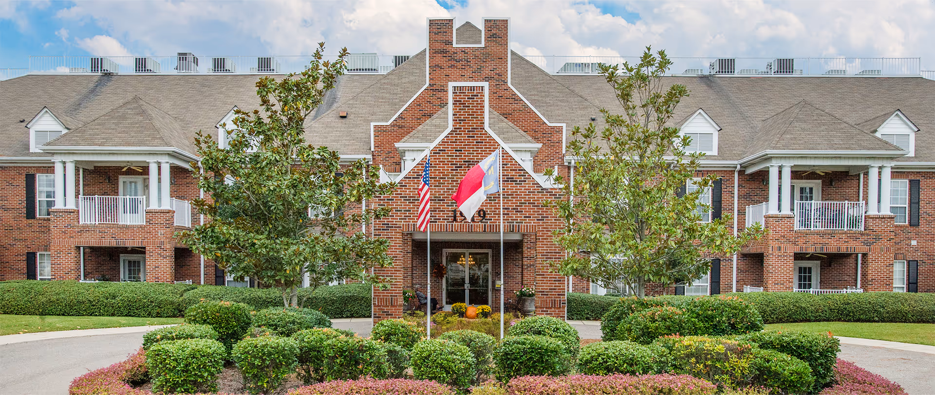 3. Brick senior living building front with flags at the entrance, balconies, and manicured landscaping around a circular drive.